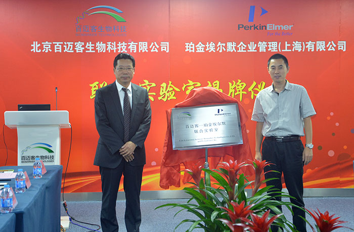 8月14日,北京百邁客生物科技有限公司與珀金埃爾默企業(yè)管理(上海)有限公司舉行了聯(lián)合實(shí)驗(yàn)室揭牌儀式。北京百邁客生物科技有限公司創(chuàng)始人、董事長兼 CEO鄭洪坤先生,珀金埃爾默亞太區(qū)生命科學(xué)副總裁兼總經(jīng)理、大中華區(qū)總裁顧憲進(jìn)先生,偕同多位雙方代表參加了揭牌儀式。