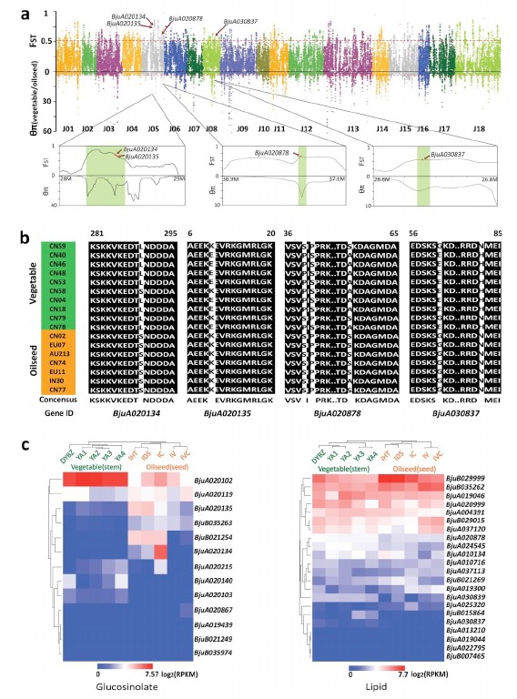 通過(guò)菜用和油用芥菜群體進(jìn)行選擇清除分析,發(fā)現(xiàn)dominance的基因被篩選出來(lái)的比例較高,同時(shí)結(jié)合轉(zhuǎn)錄組數(shù)據(jù),這部分基因在油用和菜用兩個(gè)群體中差 異表達(dá)。同時(shí)通過(guò)上面的分析發(fā)現(xiàn)與硫苷,脂類(lèi)代謝顯著相關(guān)并且存在dominance的基因組,這些基因在油用菜用群體中有各自獨(dú)特基因分型。
