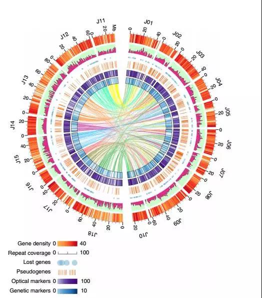 然后利用遺傳圖和光學圖譜對A、B亞基因組進行區(qū)分,整體掛載效果非常好,A為91.48%,B為72.32%。利用光學圖譜和遺傳圖譜對基因組進行區(qū)分,為其他多倍體物種基因組研究提供了參考。