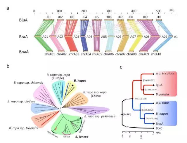 我們對10個菜用的芥菜、7個油用的芥菜,5個甘藍型油菜基因組、27個白菜基因組(多亞種)進行了重測序分析,并繪制如上圖b中的進化樹。從b圖中可以看到芥菜全部聚在一起,沒有出現(xiàn)分散的情況,說明芥菜中A的基因組是來源于同一個亞種,屬于單系起源。