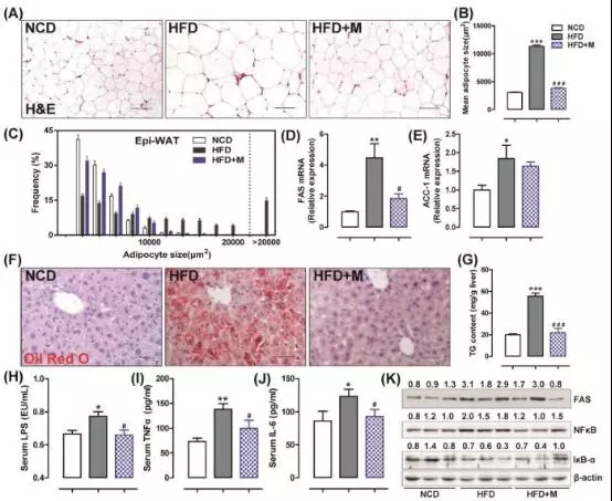 1)?通過比較Epi-WAT脂肪細胞的大小,發(fā)現(xiàn)HFD組脂肪細胞顯著增大;而褪黑素通過減少>12000μm2的細胞數(shù)目,增加2000–8000μm2的細胞數(shù)目,使HFD+褪黑素組脂肪細胞大小維持在正常范圍內,如下圖A-C。