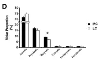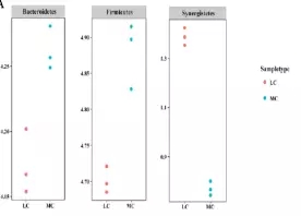 在細(xì)菌門水平,一共有14個(gè)原核的門被鑒定,主要是厚壁菌門(35.7-30.1%),擬桿菌門(26.6-43.6%)、互養(yǎng)菌門(11-7%),且通過(guò)門水平維恩圖分析發(fā)現(xiàn),在兩組(MC和LC)間門水平組成相同,比較分析兩組間微生物變化情況發(fā)現(xiàn)(如圖:FIG2),MC組相比于LC組,互養(yǎng)菌門增長(zhǎng)了57%,無(wú)壁菌門增長(zhǎng)了330%。而黏膠球形菌門降低了63%,纖維桿菌門降低了65%;