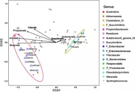 通過(guò)CCA相關(guān)性分析發(fā)現(xiàn),顯著上調(diào)的GPRs和HDACs與8個(gè)顯著增加的微生物屬(56個(gè) OTUS)是呈正相關(guān),顯著下調(diào)的GPRs和HDACs和9個(gè)顯著減少的細(xì)菌屬呈正相關(guān)(63個(gè)OTU),然而HDAC1與丁酸鹽的比例呈負(fù)相關(guān)。