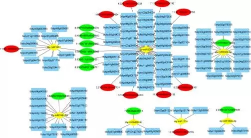 為了進(jìn)一步揭示circRNA在果實成熟中的作用,我們對circRNA靶向的miRNA以及miRNA的靶標(biāo)mRNA進(jìn)行了預(yù)測。結(jié)果發(fā)現(xiàn)其中20個circRNA上含有7個miRNA結(jié)合位點,同時鑒定出94個miRNA的靶標(biāo)mRNA。通過對鑒定到的94個靶標(biāo)mRNA進(jìn)行GO富集和KEGG分析,總結(jié)出circRNA可能通過調(diào)節(jié)代謝過程、激素平衡以及光合相關(guān)的通路來調(diào)控番茄果實成熟。此外,circRNA還可能通過參與轉(zhuǎn)錄調(diào)控,主要是通過調(diào)節(jié)包括ERF、SBP、MYB等果實成熟相關(guān)的轉(zhuǎn)錄因子,來調(diào)節(jié)番茄果實的成熟。