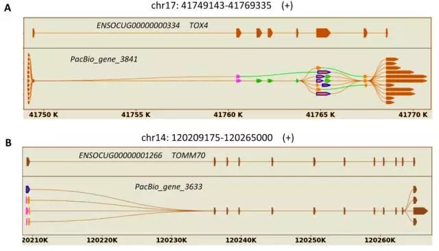 Figure 2. 三代測得轉(zhuǎn)錄本的不同isoforms,在數(shù)據(jù)庫中的參考基因模型如圖示中被標(biāo)記有染色體位置、基因ID和基因名稱