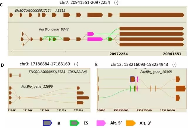 PacBio鑒定到多達(dá)24,797個AS事件,并對這些可變剪接進行分類統(tǒng)計(Table 1),在兔的參考基因組中僅發(fā)現(xiàn)2,398個AS事件,將數(shù)據(jù)合并后共得到34,173個AS事件,且可變剪接事件包含不同的4中類型,另外,鑒定到11,184個APA事件。挑選5個基因,并用圖表示出不同的isoform比對到參考基因模型上(Figure 2)。