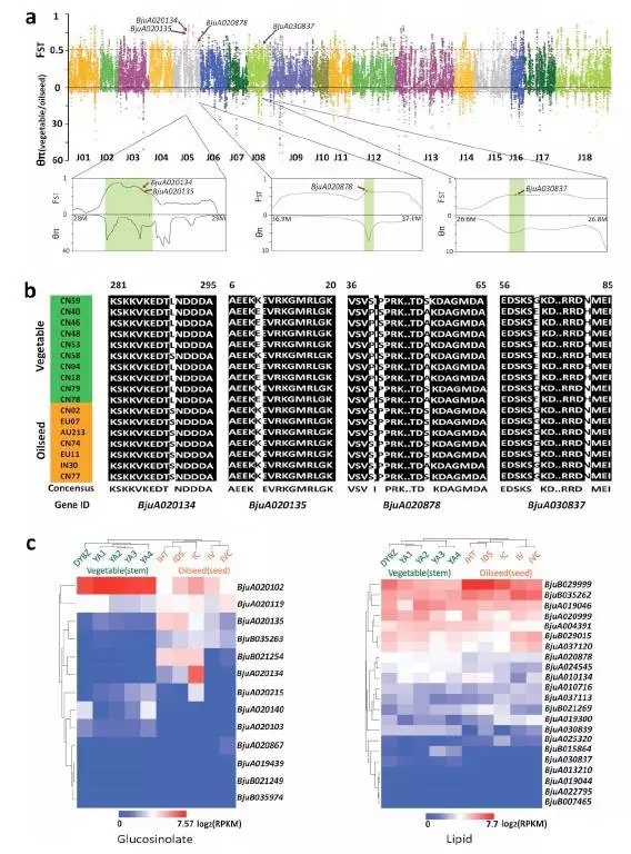 通過菜用和油用芥菜群體進行選擇清除分析,發(fā)現(xiàn)dominance的基因被篩選出來的比例較高,同時結(jié)合轉(zhuǎn)錄組數(shù)據(jù),這部分基因在油用和菜用兩個群體中差異表達。同時通過上面的分析發(fā)現(xiàn)與硫苷,脂類代謝顯著相關(guān)并且存在dominance的基因組,這些基因在油用菜用群體中有各自獨特基因分型。