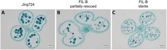 1、育性分析:FIL-B(育性不穩(wěn)定系)分為育性部分恢復的植株和完全不育植株,本項目所構建的BC4群體462個子代中有14.9% 的植株為育性部分恢復的表型。育性部分恢復植株的花粉大小小于正常花粉,大于完全不育植株的花粉(Fig 1.)。經I2-KI染色后的不育花粉表現出形態(tài)的不規(guī)則和染色的異常(Fig 2.)。