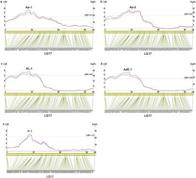 共定位到了26個(gè)和珍珠品質(zhì)相關(guān)的QTL,分別位于第1,4,8,14,15和17號(hào)連鎖群上,PVE范圍為8.45%-22.8%。在1號(hào)連鎖群上定位到3個(gè)殼寬QTLs,在第1和第15號(hào)連鎖群上分分別定位到1個(gè)控制殼重的QTL。第8號(hào)染色體上定位到體重相關(guān)的7個(gè)QTL,另外,作者也定位到了大量其他性狀的QTL。同時(shí)對(duì)第17號(hào)染色體上的4個(gè)和貝殼珍珠層顏色相關(guān)的QTL進(jìn)行簡(jiǎn)單的統(tǒng)計(jì)驗(yàn)證。