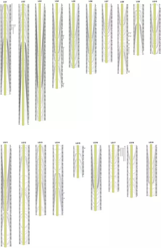 作者之前利用SSR標(biāo)記做的遺傳圖譜和利用SLAF-seq構(gòu)建的遺傳圖譜進(jìn)行了比較。兩張遺傳圖譜均構(gòu)建了珍珠蚌19條連鎖群,但是標(biāo)記數(shù),圖距,分辨率均不同。SSR標(biāo)記包含了506個(gè)標(biāo)記,總圖距1,922.3cM,平均圖距3,99cM,大的Gap數(shù)較多,而基于SLAF-seq的圖譜在以上指標(biāo)上均顯著優(yōu)于SSR標(biāo)記圖譜。