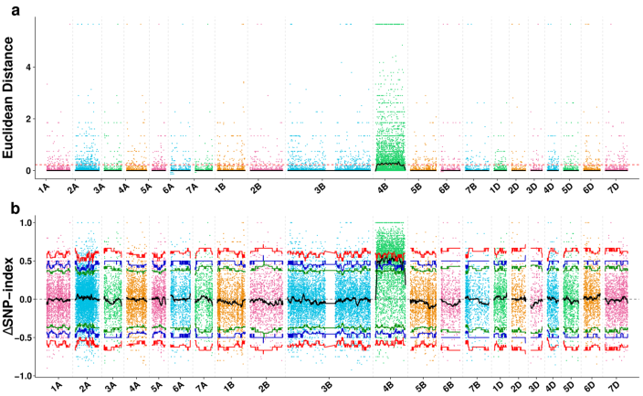利用SNP-index和ED兩種算法,將抗病基因YrR39定位在4B染色體上17.39 Mb的區(qū)域內(nèi)。(這里就不細(xì)說(shuō)了,直接上圖)