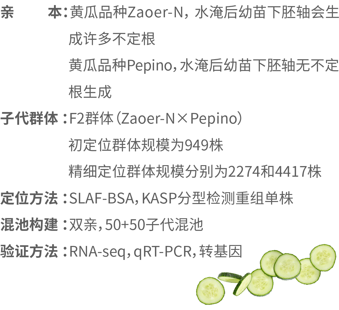 黃瓜是重要的蔬菜品種,其根生長淺,對氧氣需求較為嚴(yán)格,這造成它對水淹脅迫非常敏感。在水淹脅迫下,黃瓜下胚軸通過產(chǎn)生不定根來獲取氧氣,以適應(yīng)水淹脅迫。為解析水淹脅迫下黃瓜不定根生產(chǎn)現(xiàn)象的遺傳學(xué)機(jī)制,研究者曾利用耐水淹材料Zaoer-N 和不耐水淹材料Pepino構(gòu)建的群體進(jìn)行QTL定位,已經(jīng)分離了一個(gè)控制不定根數(shù)目的主效QTL ARN6.1,該QTL在多年的實(shí)驗(yàn)均解釋了較高的表型貢獻(xiàn)率。本研究將對該QTL進(jìn)行精細(xì)定位,確定引起性狀差異的基因,并進(jìn)行多方面的驗(yàn)證。
