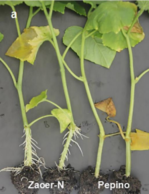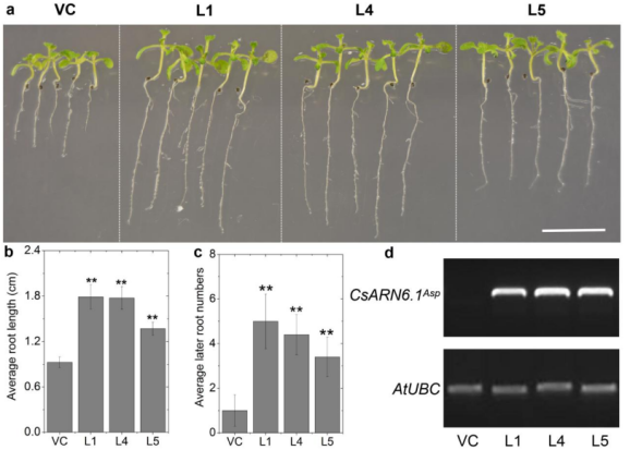 為驗(yàn)證CsARN6.1的功能,將CsARN6.1^Asp轉(zhuǎn)入擬南芥中,發(fā)現(xiàn)轉(zhuǎn)基因植株的根長顯著長于對照,同時(shí),轉(zhuǎn)基因植株上可以明顯觀察到側(cè)根發(fā)育,而對照組則沒有側(cè)根發(fā)育(圖8)。為進(jìn)一步驗(yàn)證,研究者將CsARN6.1^Asp轉(zhuǎn)入黃瓜品種Xintaimici(CsARN6.1^Gly型),并經(jīng)多代自交和篩選,獲得單拷貝的純合轉(zhuǎn)基因植株。發(fā)芽后3天,轉(zhuǎn)基因植株的初生根長度顯著長于野生型。水淹處理后,轉(zhuǎn)基因黃瓜下胚軸中CsARN6.1的表達(dá)量顯著高于野生型。處理后7天,轉(zhuǎn)基因黃瓜下胚軸的不定根數(shù)目明顯高于野生型(圖9 e.f.g.h)。另外,野生型黃瓜葉片和子葉的萎黃病較轉(zhuǎn)基因黃瓜嚴(yán)重。以上轉(zhuǎn)基因結(jié)果證實(shí)CsARN6.1能夠促進(jìn)不定根形成和黃瓜水淹耐受力(圖9 i.j)。