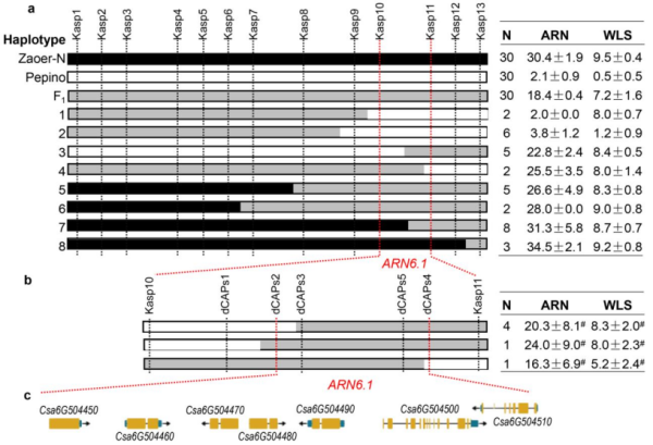 利用定位區(qū)間側(cè)翼SLAF標(biāo)記(SLAF_marker_192310和SLAF_marker_192096)上的SNP,分別各開發(fā)KASP標(biāo)記(KASP1和KASP13),并對2274個(gè)F2子代進(jìn)行分型,獲得33個(gè)重組個(gè)體;再在KASP1和KASP13之間開發(fā)11個(gè)KASP標(biāo)記,對33個(gè)重組個(gè)體進(jìn)行基因分型,共得到8種單倍型。結(jié)合重組個(gè)體基因分型和表型數(shù)據(jù),將ARN6.1定位到61.5kb的區(qū)間(KASP10和KASP11)(圖4a)。為進(jìn)一步縮小區(qū)間,利用KASP10和KASP11對4417個(gè)F2個(gè)體進(jìn)行分型,得到6個(gè)重組個(gè)體,這6個(gè)重組個(gè)體分別自交得到6個(gè)F2:3家系,然后利用新開發(fā)的5個(gè)dCAPS對F2:3家系進(jìn)行分型,結(jié)合所有表型數(shù)據(jù),最終將ARN6.1定位在36.1kb的范圍內(nèi)(圖4b)。對該區(qū)進(jìn)行注釋,共有7個(gè)基因(圖4c),有趣的是,其中5個(gè)基因都被預(yù)測為編碼AAA 型的ATP酶家族蛋白。