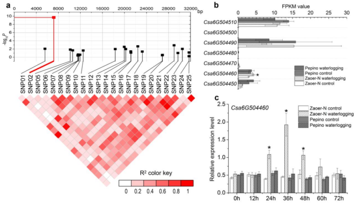 2個(gè)親本重測序分析,在36.1kb的區(qū)間內(nèi)開發(fā)到25個(gè)SNP,為確定哪個(gè)SNP與性狀真實(shí)相關(guān),研究者對100個(gè)黃瓜自交系的23個(gè)SNP(2個(gè)SNP只存在于Zaoer-N中而被過濾掉)進(jìn)行分型,結(jié)合每個(gè)自交系不定根數(shù)目的表型數(shù)據(jù)進(jìn)行局部關(guān)聯(lián)分析,結(jié)果顯示SNP02與表型有較強(qiáng)的關(guān)聯(lián)性。對SNP02分析發(fā)現(xiàn),其位于Csa6G504460的第二外顯子,可能就是引起變異的SNP位點(diǎn)(圖5a)。