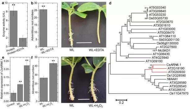 進(jìn)化樹分析顯示,CsARN6.1與擬南芥At2G18190和At3G50930存在較高的同源性(圖10d),而在之前研究中發(fā)現(xiàn),H2O2處理擬南芥后,At2G18190.1和At3G50930.1被顯著誘導(dǎo)表達(dá)。水淹后植物體內(nèi)H2O2積累是普遍的生理響應(yīng)。因而研究者嘗試在水中加入H2O2后處理Zaoer-N幼苗,與無水處理的對照相比,48h后處理組植株CsARN6.1的表達(dá)量是對照組的4.3倍,與不加H2O2的水處理的對照相比,48h后CsARN6.1的表達(dá)量是對照組的2.1倍(圖10 e)。5天后統(tǒng)計(jì)不同處理的材料下胚軸不定根數(shù)目,發(fā)現(xiàn)與不加H2O2的水處理的對照相比,水中加入H2O2的處理組的不定根數(shù)目增加60%(圖10 f.g)。
