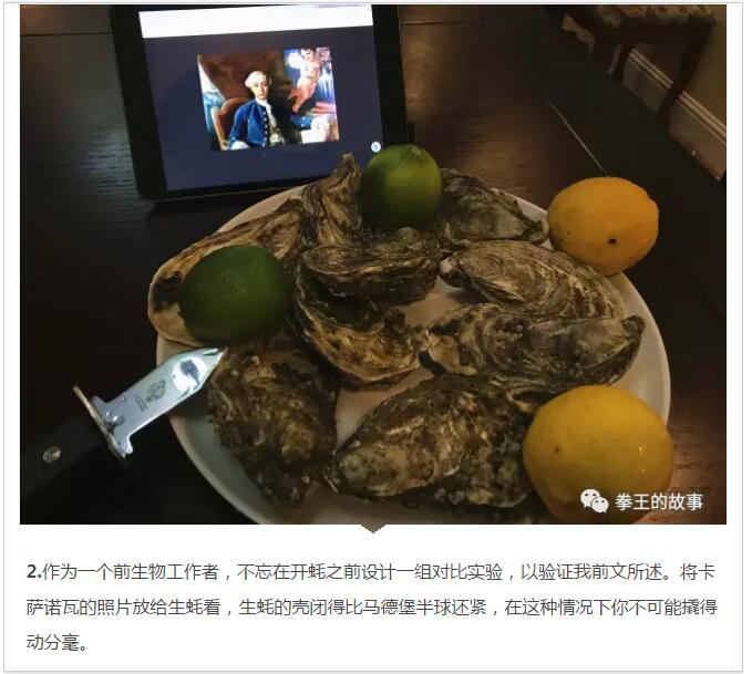 我曾經(jīng)做過一個實驗,把卡薩諾瓦的畫像放在一盤生蠔面前,然后用有道詞典里的意大利語發(fā)音反復播放“Giacomo Girolamo Casanova”,這盤生蠔當時就怒了,以至于我把他們放到烤箱里烤了20分鐘都無法將殼撬開。—–在殺父之仇面前,生蠔們突破了自己的生理極限。