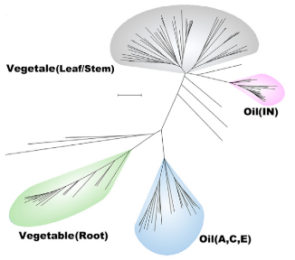 研究中還發(fā)現(xiàn)了Vegetable (Root)型最先分化,然后是Oil (A,C,E),最后是Oil (IN) 與Vegetable (Leaf/Stem)的分化,并計算分化時間,分別是:0.067 Mya,0.065 Mya和0.032 Mya