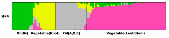 利用主成分分析來評估遺傳變異,分析結(jié)果顯示主要分為4個群:Vegetable(Leaf/Stem),Vegetable (Root),Oil (IN)和Oil (A,C,E),該結(jié)果與系統(tǒng)發(fā)育樹結(jié)果一致。