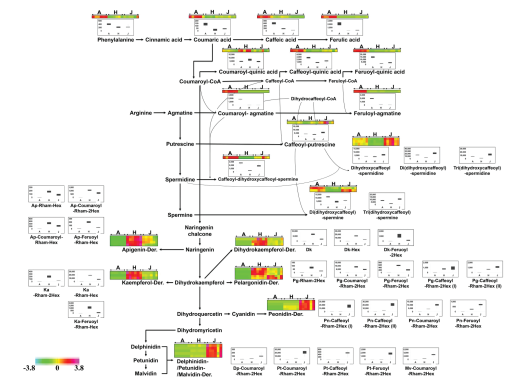 花青素是苯丙素通路中類(lèi)黃酮合成的花色素苷的?;擒铡?jù)報(bào)道,花青素衍生物飛燕草色素(Dp),芍藥色素(Pn)和錦葵色素(Mv)是紫色和深色的色素來(lái)源,而花青色素(Cy)和花葵素(Pg)的衍生物是亮紅色果實(shí)中的主要色素。結(jié)果顯示,Hongyoung與Jayoung在苯丙素合成途徑下游的黃酮類(lèi)組分差異顯著,表明這些代謝物可能是造成馬鈴薯品種間色澤差異的關(guān)鍵因素。Hongyoung中芹黃素、山柰酚、二氫山柰酚和天竺葵色素衍生物的含量較高,而Jayoung中芍藥花青素、牽牛花色素、飛燕草色素和錦葵色素衍生物積累較多。