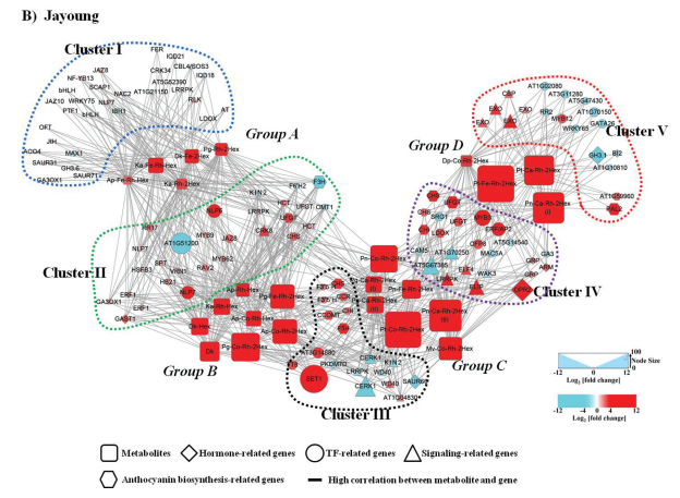 對(duì) 22 個(gè)花青素衍生物和 167 個(gè)基因(三個(gè)馬鈴薯品種中類(lèi)黃酮代謝、植物激素、信號(hào)通路、轉(zhuǎn)錄因子相關(guān)的差異表達(dá)基因)相關(guān)性分析,發(fā)現(xiàn)有 119 個(gè)基因與這 22 個(gè)花青素衍生物相關(guān)性極高(相關(guān)系數(shù)>0.9)。在 Hongyoung 和 Jayoung 中對(duì)相關(guān)性高的 119 個(gè)基因和22個(gè)代謝物做共表達(dá)網(wǎng)絡(luò)分析,把119個(gè)基因參與的調(diào)控網(wǎng)絡(luò)聚為5組(ClusterI-V),22 個(gè)花青素衍生物參與的代謝通路分為 4 組 (Group A-D) 。