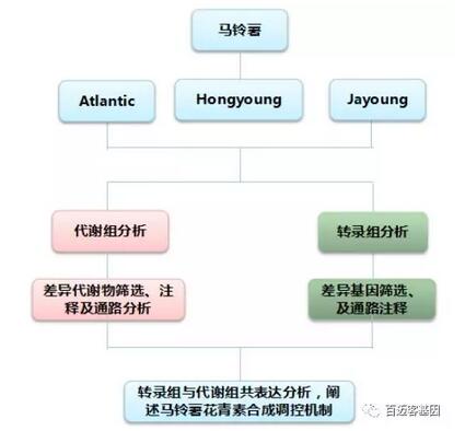 1.本研究對(duì)三個(gè)不同品種的馬鈴薯樣品同時(shí)做轉(zhuǎn)錄組和代謝組,首先通過(guò)代謝組分析不同馬鈴薯品種與色澤合成的差異代謝物,然后采用轉(zhuǎn)錄組,篩選與色澤合成相關(guān)的類(lèi)黃酮代謝、植物激素、信號(hào)通路、轉(zhuǎn)錄因子相關(guān)的差異基因,最后將色澤合成相關(guān)的差異代謝物和差異基因做關(guān)聯(lián)分析,挖掘馬鈴薯色澤的調(diào)控網(wǎng)絡(luò)。