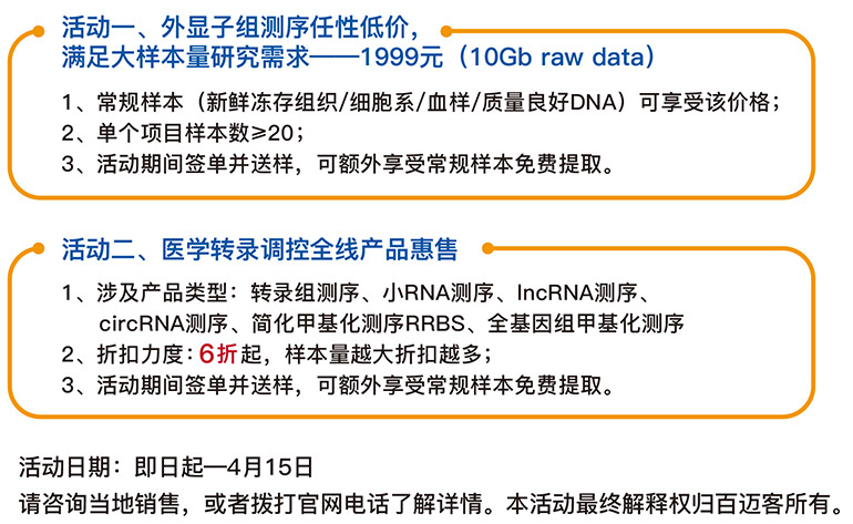 開學季,放禮季,百邁客醫(yī)學產(chǎn)品全線促銷活動開啟。百邁客全外顯子組測序(10Gb/樣本,Q30>85%),主流外顯子捕獲平臺羅氏NimbleGen SeqCap EZ Exome Library V3和安捷倫 SureSelect Human All Exon V6,一律1999元/樣本?。ǖ饶銇韮旛r)