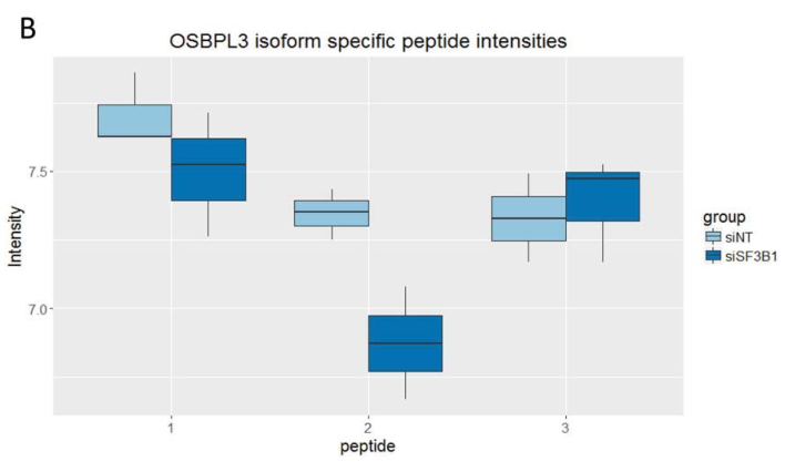 約65%的顯著差異表達(dá)的splice-specific-peptides在RNA水平上表現(xiàn)出一致的表達(dá)差異。例如,下調(diào)SF3B1的實(shí)驗(yàn)組中,OSBPL3 9號(hào)外顯子中分別有3個(gè)支持外顯子保留和1個(gè)支持外顯子去除的peptides被鑒定出來。兩種inclusion specific-peptides表達(dá)明顯較低,而exclusion specific -peptides則與對照相比表現(xiàn)出較高的表達(dá)量(如圖5所示)。