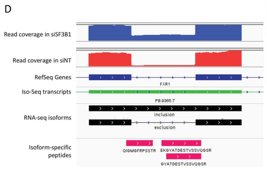 例如,全長轉(zhuǎn)錄本進(jìn)行測序結(jié)果支持FXR1內(nèi)含子保留的三種肽段,因此這種內(nèi)含子保留事件也存在于注釋文件中。Illumina 測到的短 reads支持這一事件,并提供了定量的證據(jù),表明它在SF3B1的下調(diào)過程中比其對照組(圖6D)更高表達(dá)。