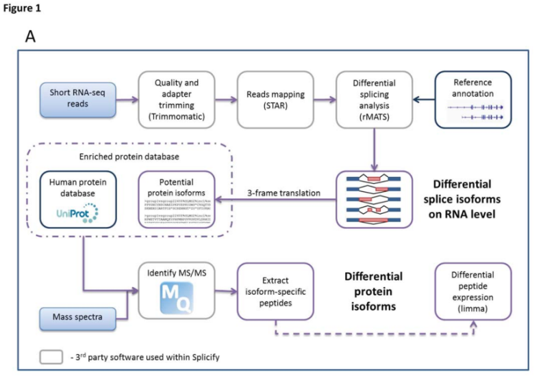 splicify作為一種基于整合RNA大規(guī)模并行測序數(shù)據(jù)和串聯(lián)質(zhì)譜蛋白質(zhì)組學(xué)數(shù)據(jù)的分析方法其新穎性在于兩組分子間選擇性剪接的差異分析,可應(yīng)用范圍很廣泛,如基因敲低與對照樣品或癌癥與健康樣品間的比較。
