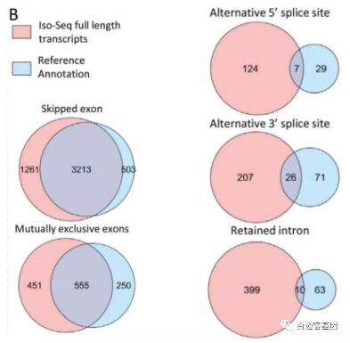 在研究可變剪接方面,Iso-Seq測到的全長轉(zhuǎn)錄本對基因組注釋結(jié)果是一個(gè)極大補(bǔ)充,尤其在內(nèi)含子保留、3 ‘可變剪接和5 ‘端可變剪接事件中,Iso-Seq測到的全長轉(zhuǎn)錄本與基因組注釋的重疊較小。這表明,基因組注釋中缺少一些完整的或部分的內(nèi)含子序列可變剪接的isoform形式。