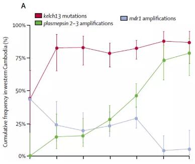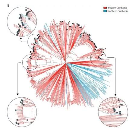 研究人員通過對來自于東南亞的1492例惡性瘧原蟲樣本的基因組序列數(shù)據(jù)分析,其中包括2007至2013年間在柬埔寨西部收集的464個惡性瘧原蟲樣本,耐藥性的不同流行病學起源通過對Kelch13青蒿素耐藥基因座和plasmepsin 2-3 哌喹耐藥基因座的單倍型分析進行鑒別。最終確定了30多個獨立的青蒿素耐藥性起源,其中91%為KEL1譜系(140/154)為耐受雙氫青蒿素哌喹抗性的寄生蟲。2008年,KEL1譜系和與哌喹抗性相關(guān)PLA1譜系相結(jié)合。2013年,KEL1/PLA1 結(jié)合譜系在柬埔寨西部頻率達到63%(24/38),并已蔓延至柬埔寨北部。