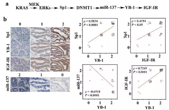 盡管我們都知道胰島素樣生長(zhǎng)因子I受體(IGF-IR)能夠促進(jìn)結(jié)直腸癌的肝轉(zhuǎn)移,但是并不清楚腫瘤是通過哪種機(jī)制上調(diào)IGF-IR表達(dá)。研究發(fā)現(xiàn)在結(jié)直腸癌細(xì)胞中,KRAS突變體通過MEK—Sp1—DNMT1—miR-137信號(hào)通路上調(diào)Y-box結(jié)合蛋白1 (YB-1),進(jìn)而轉(zhuǎn)錄激活I(lǐng)GF-IR基因表達(dá)。后續(xù)46例KRAS突變的CRC患者肝轉(zhuǎn)移免疫組織化學(xué)評(píng)估試驗(yàn)也進(jìn)一步證實(shí)這一發(fā)現(xiàn),Sp1、 miR-137、YB-1和IGF-1R之間的表達(dá)顯著相關(guān)。在動(dòng)物模型中,通過基因敲減或MEK藥物抑制下調(diào)YB-1和IGF-IR的表達(dá),可阻止KRAS突變的結(jié)直腸癌肝轉(zhuǎn)移。