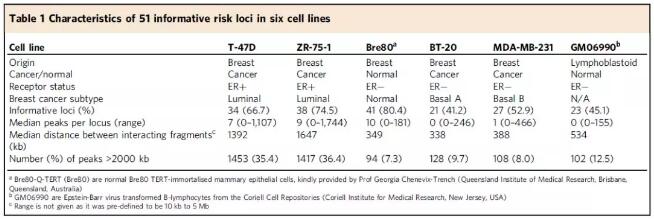 在2種ER +乳腺癌細胞系(T-47D,ZR-75-1)、2種ER-乳腺癌細胞系(BT-20,MDAMB-231)、1種“正?!比橄偕掀ぜ毎?(Bre80-Q-TERT/Bre80)和1種非乳腺類淋巴母細胞系(GM06990)中進行了CHi-C測序。風險基因座定義為包含至少1個風險SNP位點在內,且包含與該SNP相關(r2>0.2)的所有SNP的一個連續(xù)區(qū)域。每個細胞系的互作peak數(shù)目在0-1744的范圍內,有12個基因座沒有在以上任何一種細胞系中鑒定到互作peak。剩余的51個loci中46個是與所有乳腺癌或者ER+乳腺癌風險相關的。