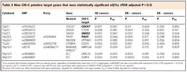 為了評估推定的靶基因在乳腺癌病因中具有因果作用的可能性,作者首先使用風險SNP(或與風險SNP連鎖不平衡的位點,r2> 0.8)和TCGA數(shù)據(jù)庫中的RNA-Seq數(shù)據(jù)(N=547)進行eQTL分析( TCGA),并對匹配的DNA甲基化數(shù)據(jù)和體細胞拷貝數(shù)變異進行了校正,根據(jù)ER狀態(tài)進行分層分析。共計鑒定到了22個顯著SNP-基因組合(t檢驗p<0.05),其中9個經過多重檢驗FDR校正后仍然顯著。其中,3個基因為鄰近基因。