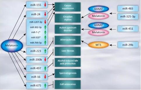 近年來,全轉(zhuǎn)錄組測序研究越來越多,拓展了我們對非編碼RNA的認(rèn)知,也發(fā)現(xiàn)了褪黑激素與非編碼RNA之間存在的功能互作,比如褪黑激素可以通過與特定的miRNA通路的功能互作,對癌癥的發(fā)展、腦環(huán)境、肝纖維化、自閉癥譜系障礙ASD、動脈粥樣化形成和精子發(fā)生等起調(diào)節(jié)作用;有研究通過RNA測序,研究了大鼠松果體中l(wèi)ncRNA每天的晝夜豐度變化,或相比于其它組織混合RNA樣本相對高表達的lncRNAs,表明脊椎動物節(jié)律生物學(xué)中l(wèi)ncRNAs的動態(tài)作用。