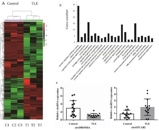 在本研究中,為了評(píng)估circRNA在人體內(nèi)的作用,作者采用了高通量測(cè)序方法,測(cè)定TLE患者和非TLE患者顳葉新皮質(zhì)中circRNA表達(dá)水平,并對(duì)環(huán)狀RNA的功能進(jìn)行了注釋。作者描述了一個(gè)包含潛在基因與circRNA-miRNA的網(wǎng)絡(luò)。
