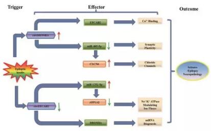 最近的基因組學(xué)研究揭示了許多與各種疾病的基因調(diào)控相關(guān)的非編碼RNA (ncRNAs)。人類癲癇中非編碼RNA的表達(dá)也發(fā)生了改變,可以作為一種新的、非侵入性的生物標(biāo)志物來(lái)改善目前的癲癇診斷。環(huán)狀RNA (circRNAs)是一種獨(dú)特的非編碼環(huán)狀RNA,circRNA與microRNAs (miRNAs)相互作用,并作為miRNA海綿,通過(guò)circRNA-miRNA-mRNA網(wǎng)絡(luò)在神經(jīng)系統(tǒng)疾病中調(diào)節(jié)基因表達(dá)。研究表明環(huán)狀RNA在神經(jīng)元功能中發(fā)揮重要作用,尤其是在突觸中。組織學(xué)研究結(jié)果證實(shí),邊緣系統(tǒng)的突觸重組似乎能逐漸增強(qiáng)皮質(zhì)興奮性,并可能導(dǎo)致癲癇發(fā)作。然而,circRNAs在癲癇中的作用仍是未知的。