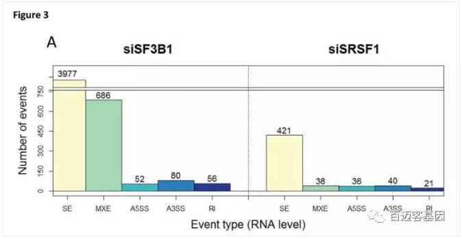 轉(zhuǎn)錄組分析顯示siSF3B1和siSRSF1的可變剪接事件與對(duì)照組相比有顯著差異(圖3A),證明對(duì)剪接因子的操作導(dǎo)致了差異剪接的產(chǎn)生。