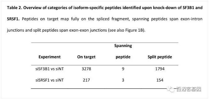 肽段數(shù)量上的差別直接和兩個(gè)實(shí)驗(yàn)剪接isoform數(shù)據(jù)庫(kù)的數(shù)目相關(guān)。總的來(lái)說(shuō),大約60%的isoform特異肽段會(huì)比對(duì)到目標(biāo)區(qū)域,跨越exon-econ junction的split 肽段約占40%,跨越 exon-intron junctions 的spanning肽段則很少被發(fā)現(xiàn)(如表2所示)。