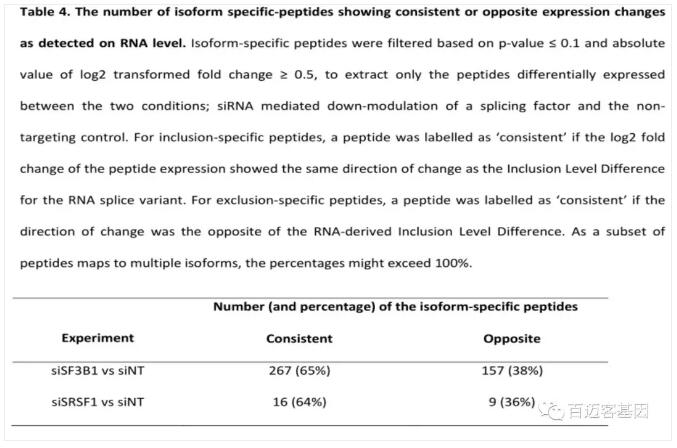 通過(guò)對(duì)剪接特異肽段進(jìn)行差異表達(dá)分析,揭示了這些肽的子集在實(shí)驗(yàn)組和對(duì)照組之間有顯著差異,指出了mRNA基因組和蛋白質(zhì)組結(jié)果之間的一致性事件(如表4所示)。