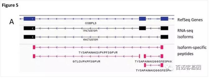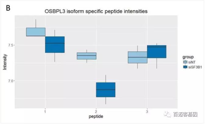 約65%的顯著差異表達(dá)的splice-specific-peptides在RNA水平上表現(xiàn)出一致的表達(dá)差異。例如,下調(diào)SF3B1的實(shí)驗(yàn)組中,OSBPL3 9號(hào)外顯子中分別有3個(gè)支持外顯子保留和1個(gè)支持外顯子去除的peptides被鑒定出來(lái)。兩種inclusion specific-peptides表達(dá)明顯較低,而exclusion specific -peptides則與對(duì)照相比表現(xiàn)出較高的表達(dá)量(如圖5所示)。