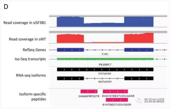 例如,全長(zhǎng)轉(zhuǎn)錄本進(jìn)行測(cè)序結(jié)果支持FXR1內(nèi)含子保留的三種肽段,因此這種內(nèi)含子保留事件也存在于注釋文件中。Illumina 測(cè)到的短 reads支持這一事件,并提供了定量的證據(jù),表明它在SF3B1的下調(diào)過(guò)程中比其對(duì)照組(圖6D)更高表達(dá)。