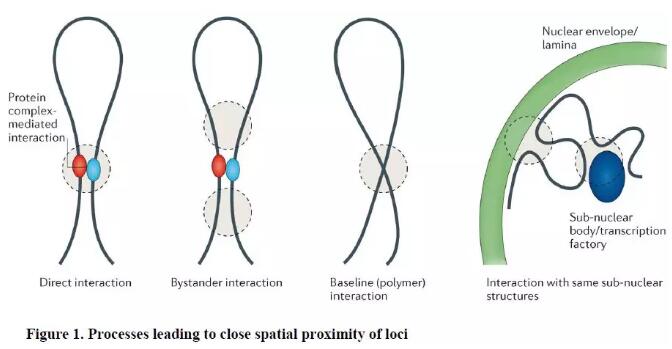 這些3C及其衍生技術(shù)報(bào)告了細(xì)胞群體中兩個(gè)基因座空間上緊密接近的頻率,但未區(qū)分功能性與非功能性的位點(diǎn)間關(guān)聯(lián),也未揭示導(dǎo)致其共定位的機(jī)制。空間上緊密接近包括以下幾種情況:1)Direct interaction:兩個(gè)基因座之間直接、特異性接觸的結(jié)果(由結(jié)合它們的蛋白質(zhì)復(fù)合物介導(dǎo));2)Interaction with the same sub-nuclear structures:成對基因座與相同亞核結(jié)構(gòu)間接共定位的結(jié)果(例如核纖層,核仁、或轉(zhuǎn)錄工廠等)。3)Bystander interaction:在某些細(xì)胞中,由于鄰近的某些遠(yuǎn)程互作或其他約束因素決定的染色質(zhì)纖維的堆積和折疊的造成的非特異性接觸,或者由于擁擠核中的隨機(jī)(非特異性)碰撞導(dǎo)致的非特異性接觸。4)Baseline(polymer) interaction:染色質(zhì)纖維非常長,而且柔韌,染色體具有聚合體性質(zhì),因此,即使在沒有任何特定高階結(jié)構(gòu)的情況下,這個(gè)特征在很大程度上也決定了基因座間相互作用的頻率。