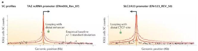 5C技術(shù)通過并行繪制多個(gè)基因座之間的互作圖譜,允許更全面地分析大量基因的染色質(zhì)成環(huán)互作。例如,最近一項(xiàng)研究中,繪制了3種人類細(xì)胞系超過600個(gè)基因啟動(dòng)子的互作圖譜,分辨率:單個(gè)限制性片段(?4Kb)。假設(shè)大多數(shù)交互不是特異的loop交互,從整個(gè)數(shù)據(jù)集中估計(jì)互作頻率的基線值,由此估計(jì)出各基因組距離的互作頻率基線。然后通過檢測顯著高于該基線的信號,以選定的p值和錯(cuò)誤發(fā)現(xiàn)率鑒定loop互作。與經(jīng)典的3C單基因座對研究相比,這種方法統(tǒng)計(jì)學(xué)分析上更嚴(yán)格,可以鑒定該基線上的顯著peak。示例見下圖。