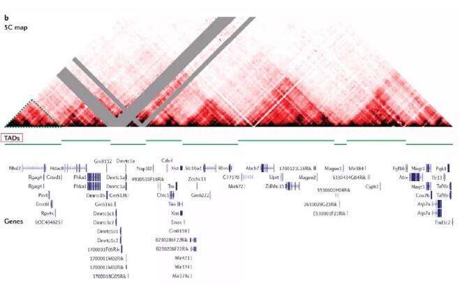 包含小鼠X染色體失活中心的4.5Mb區(qū)域的高分辨率5C互作圖揭示了一系列大的結(jié)構(gòu)域。位于這些TADs內(nèi)的基因座往往頻繁地相互作用,但它們與位于其領(lǐng)域之外的基因座的相互作用要少得多,即TAD內(nèi)部的相互作用強(qiáng),不同TAD間的相互作用弱。這種特征使研究人員能夠通過分析分辨率較低的全基因組Hi-C互作圖與隱馬爾可夫模型方法結(jié)合,來識別整個(gè)人類和小鼠基因組中的TAD。TADs是染色體的通用結(jié)構(gòu)模塊,人類和小鼠的基因組都由2000多個(gè)TAD組成,覆蓋了90%以上的基因組。