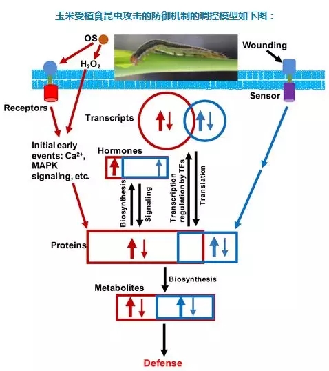Qi J[4]等,利用多組學(轉錄組學、蛋白組學、代謝組學)技術,探索了玉米受植食昆蟲攻擊的防御機制,并構建繪制了系統(tǒng)的調(diào)控模型。這些數(shù)據(jù)對玉米防御昆蟲災害的進一步遺傳學研究搭建了很好的框架,也為抗昆蟲災害的玉米新品種的培育奠定了良好的基礎。