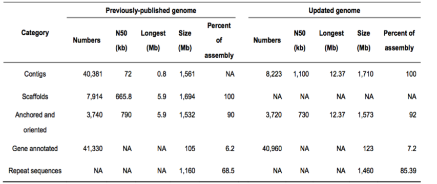 (3)亞洲棉原基因組(二代)與更新后基因組(三代)比較(表1):