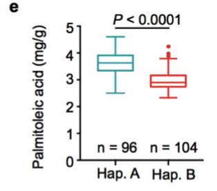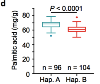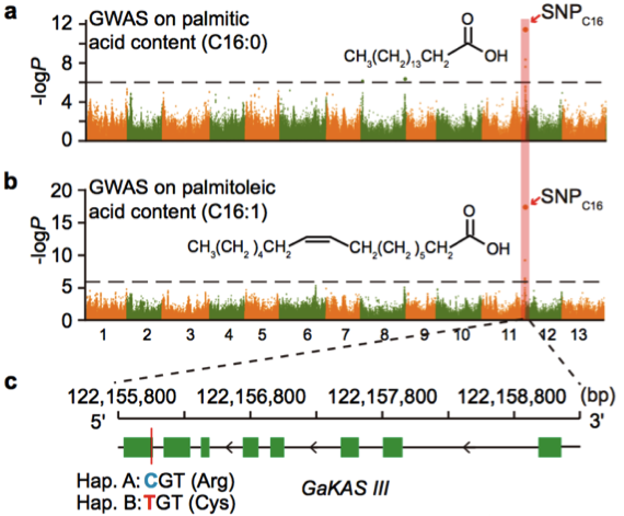 a. 棕櫚酸含量的GWAS關(guān)聯(lián)分析;b. 棕櫚油酸的GWAS關(guān)聯(lián)分析;c. GaKASIII基因的變異(Arg/Cys);d-e. Hap. A和Hap. B中棕櫚酸和棕櫚油酸含量比較