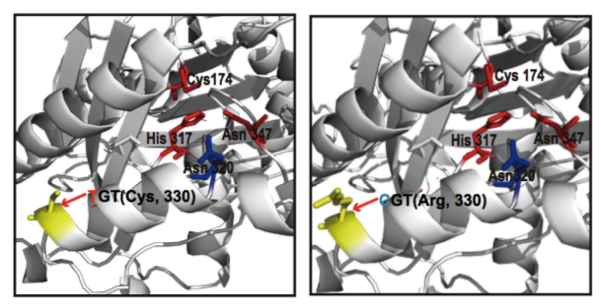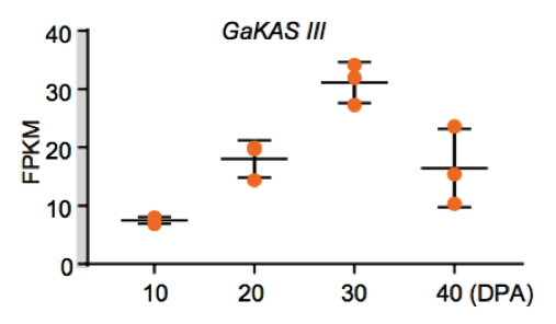 (1)脂肪酸含量相關(guān)基因的定位與研究 棉花是世界上第六大植物油來源,通過GWAS關(guān)聯(lián)分析,在11號染色體上的GaKASIII基因組座位上(Ga11G3851)的第8個外顯子區(qū)獲得了1個顯著的SNP位點,該基因編碼3-Oxoacyl-[acyl-carrier-protein ACP] synthase III(3-氧?;?[酰載體蛋白]合酶III),如圖8 a-c,KASIII基因編碼的這一關(guān)鍵酶可以使得脂肪酸鏈從C2到C4延伸,并最終確定種子中棕櫚酸(C16:0)和棕櫚油酸(C16:1)的組成。GaKASIII基因的多態(tài)性導致了保守的ACP_synthase_III_(酰載體蛋白合酶III)結(jié)構(gòu)域中半胱氨酸/精氨酸間的置換(圖8 c),單倍型B(TGT,Cys)主要出現(xiàn)在低含油量種質(zhì)中,而在高含油量種質(zhì)中發(fā)現(xiàn)單倍型A(CGT,Arg)(圖8 d-e)。GaKASIII基因在開花后(DPA)的30天表達量最高(圖9),這是種子油量積累的關(guān)鍵階段,在單倍型種質(zhì)A中,C16:0和C16:1含量以顯著的速率累積(圖10);蛋白質(zhì)結(jié)構(gòu)模型預測顯示,半胱氨酸/精氨酸殘基位于α螺旋處,該位點靠近酶活性位點,同時是輔酶A(CoA)結(jié)合位點(圖11)。